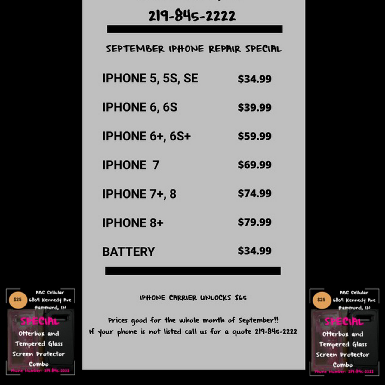 ABC Wireless can be contacted at 219 554-1111. 6804 Kennedy Ave Hammond IN 46323. To get more details you can call us on 219-845-2222.